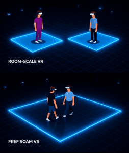 Room scale: Each player has their own space (at least 2mx2m) and plays individually. Movement is physically within that space and also uses game controls such as teleporting or by using joysticks. The advantage is that one large space is not required. Unconnected smaller spaces can be used.