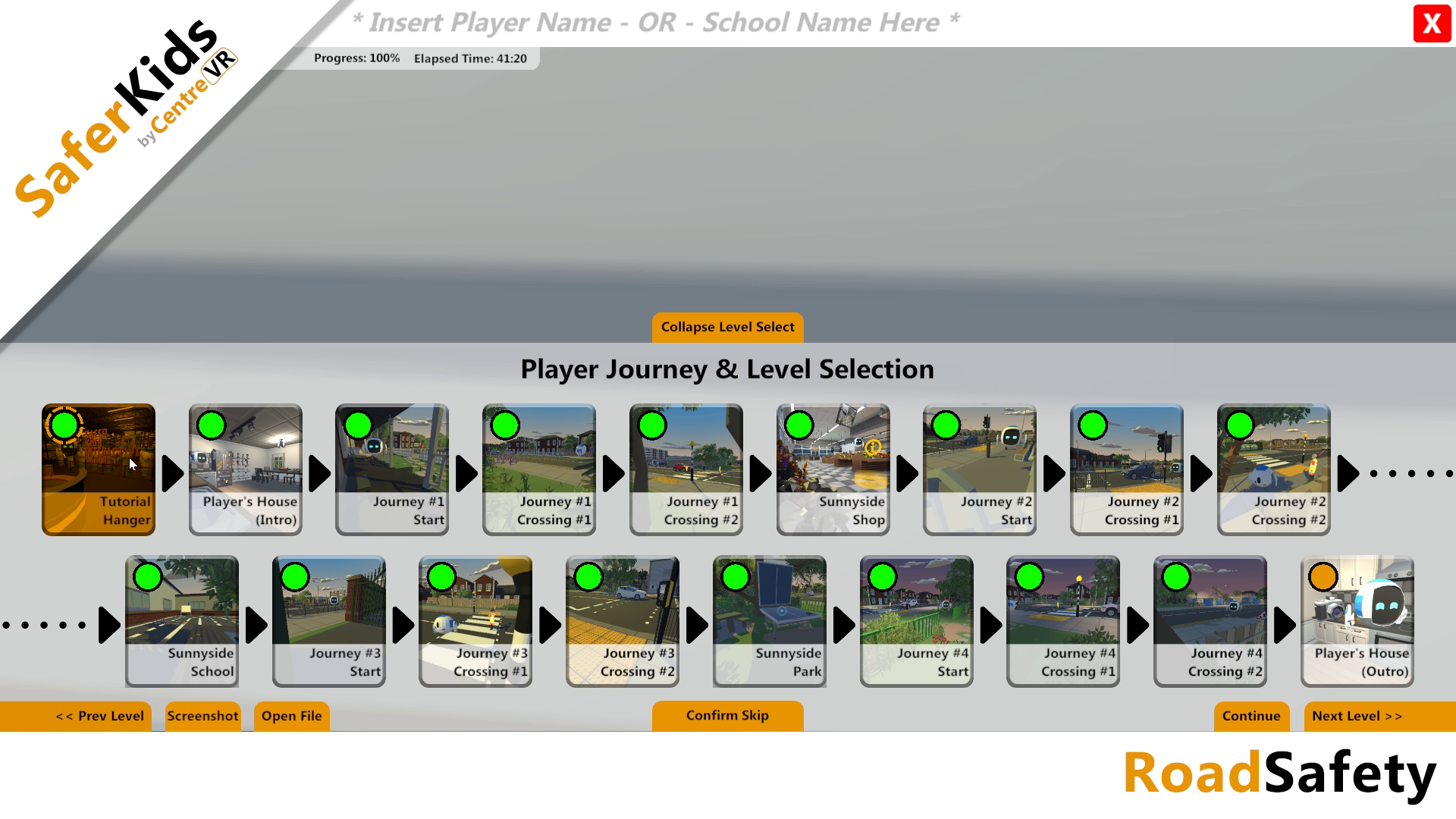 Children enter the world of S.K.I.E. The Safer Kids Interactive Expert, who guides each individual child on a journey from home to school, and back again. On the way, SKIE explains every crossing. On the way home, they cross the same roads, with minimal assistance, and are scored as they progress.